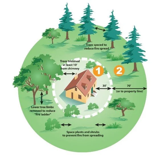 Defensible space is an area maintained around a structure with the purpose of reducing risk to fire danger. The general idea is to reduce and remove fuels around your house so that it’s less likely to catch fire. This is probably the simplest and most effective way to reduce the risk of wildfire around your home. Here are some key strategies: